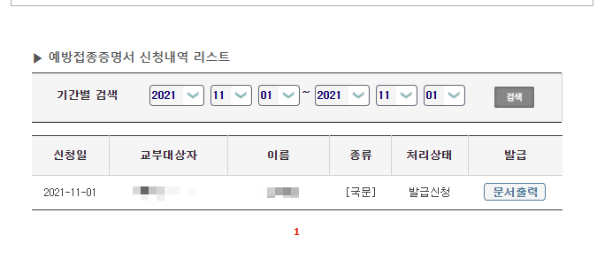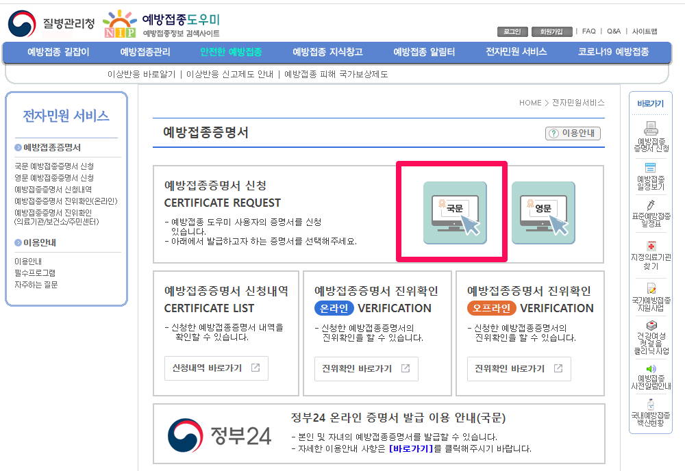 2. 예방접종증명서 신청 중에 '국문'을 선택