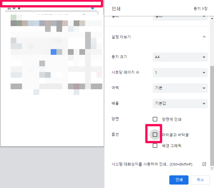 [인쇄설정]을 누르면 나오는 화면에서 머리글과 바닥글의 선택을 해제합니다.