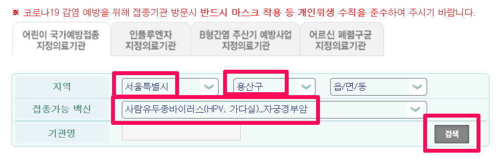 거주지를 선택하고 백신은 사람유두종바이러스(HPV, 가다실)_자궁경부암 을 선택한 뒤 검색을 누릅니다.