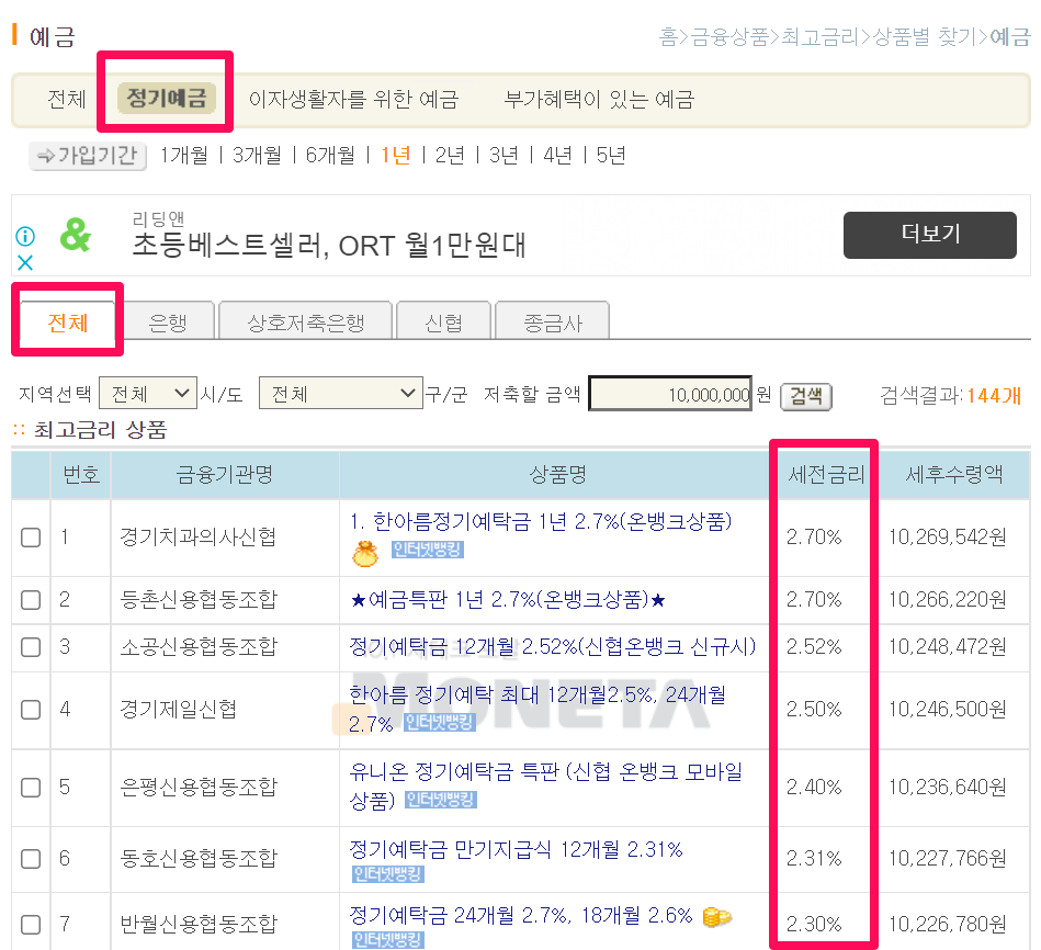 2. 모네타 사이트의 정기예금금리비교 바로가기👉