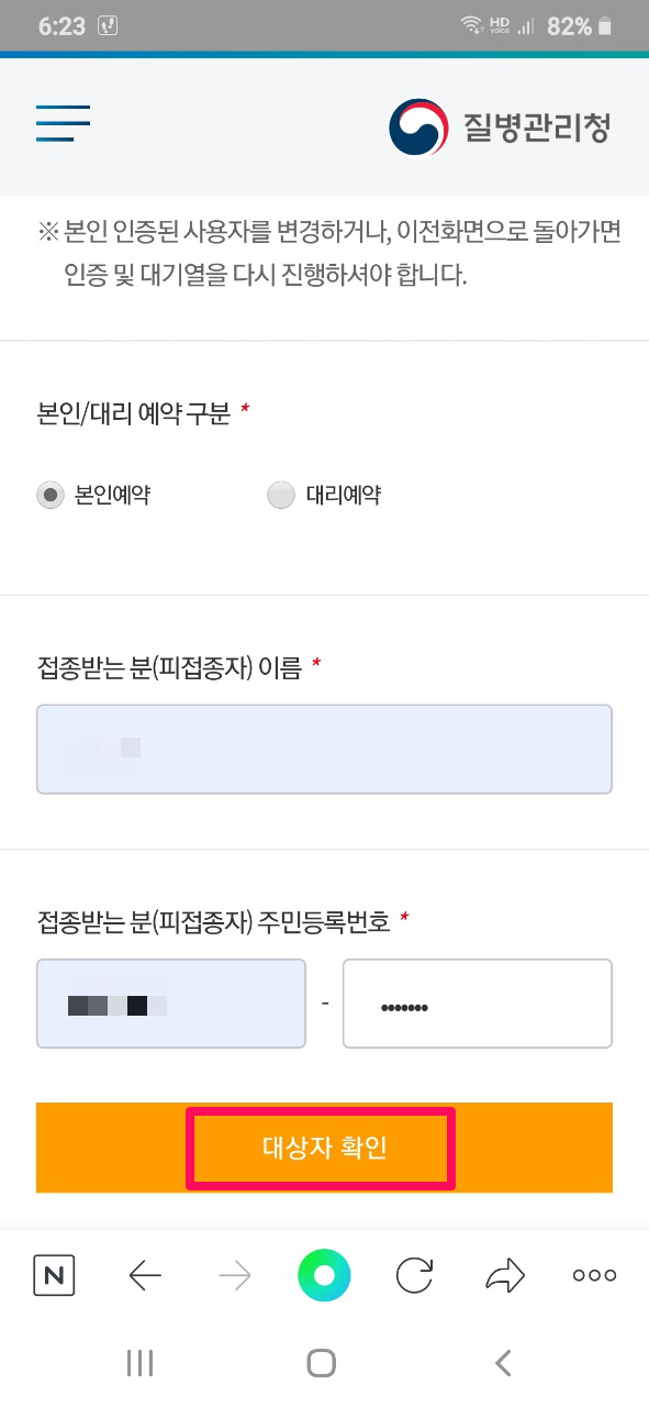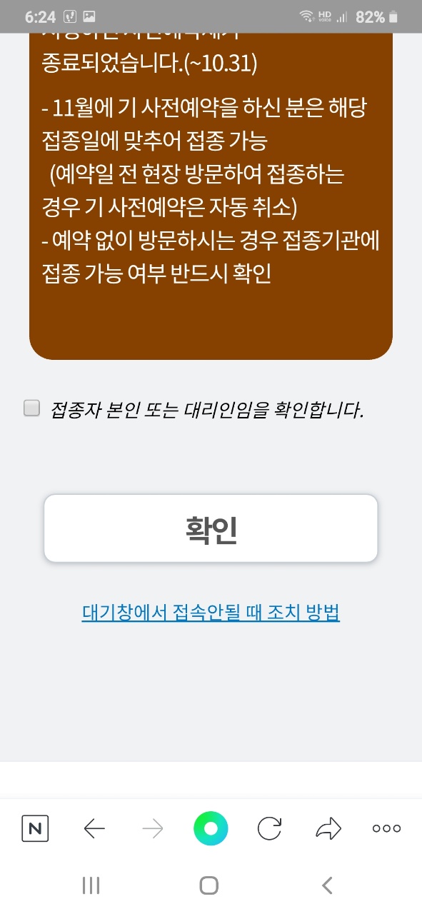 코로나19 예방접종 사전예약 '예약하기'> 하단에 '확인'>인증(카카오인증 추천)>본인확인