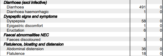 설사가 491건, 소화불량이 58건, 복부팽만감 36건, 전체적인 복통 153건, 상복부통증이 343건, 복부불편감 64건, 메스꺼움 2003건, 구토 702건, 구강건조 53건, 구강궤양 42건 등으로 보고되었다고 합니다.