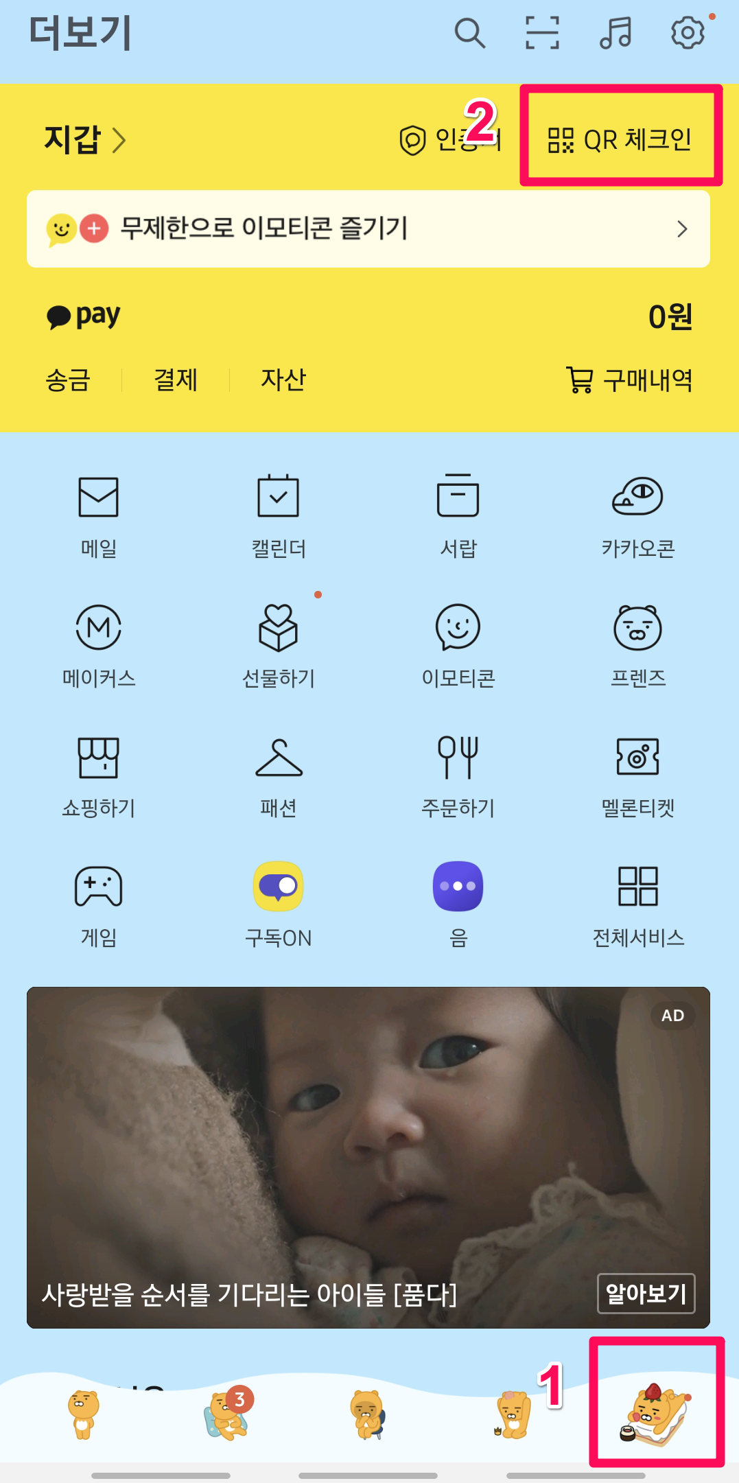 (1) 카카오톡 어플을 열고 하단 가장 하단 우측에 있는 '더보기' 항목을 누르고 우측 상단에 있는 QR체크인을 누릅니다.