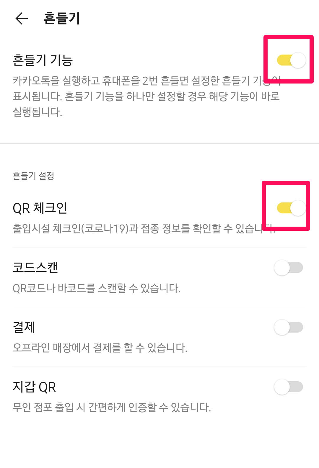 (5) 흔들기 메뉴로 들어가서 아래 화면과 같이 기능을 켜주고 QR 체크인을 켜줍니다.