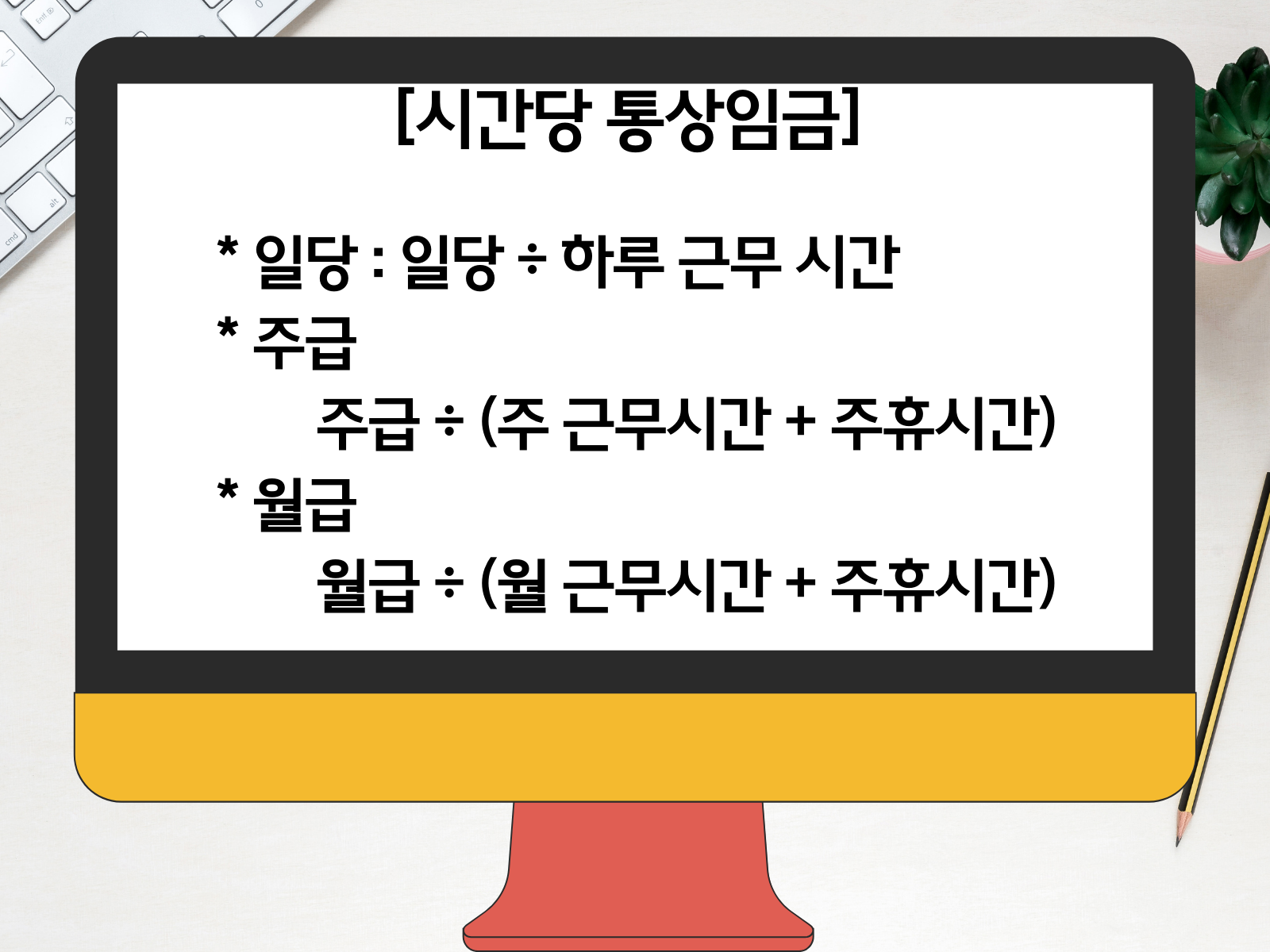 - 연장근로수당, 출장비, 업무활동비 등은 통상임금에 포함되지 않습니다.