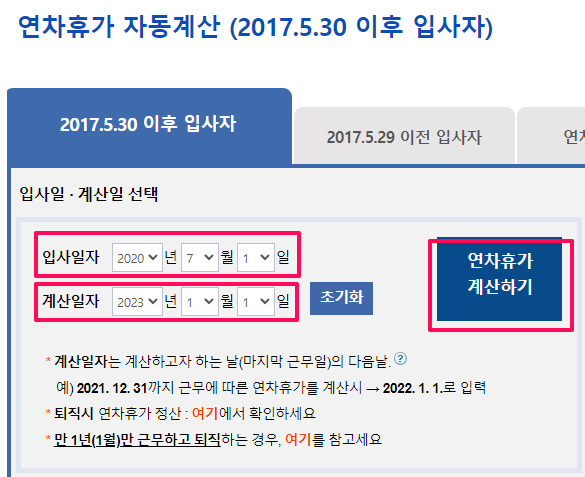 ① 위 링크로 들어가서 입사일자와 계산 일자를 입력합니다. 계산 일자는 좀 더 미래 시점을 넣어야 앞으로 연차가 어떻게 될지 여러 해를 계산해줍니다.