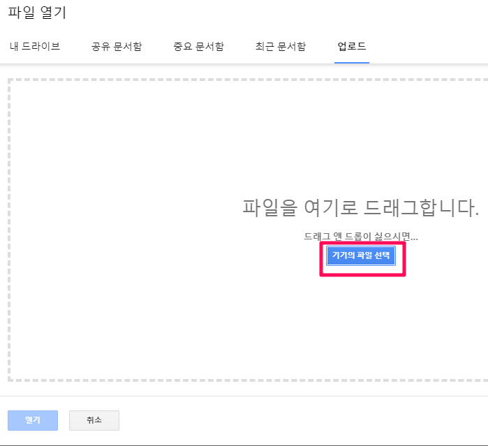 5. '업로드'를 선택하고 '기기의 파일 선택'을 누릅니다.