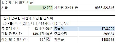 - 이 경우 시급과 시간당 통상임금과 동일하고, 실제 근무시간과 계산된 주휴 시간에 시급을 곱하여 총급여를 계산하게 됩니다.