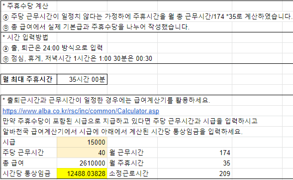 | 주휴 시간의 계산은 근무시간이 주마다 일정치 않은 경우로 가정 1개월 총 근무시간 ÷ 174 × 35 이런식으로 계산되었습니다. |