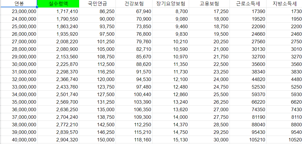 - 구글 스프레드 링크로 들어가면 2023 연봉 실수령액 4대 보험은 10원 미만 절사 하였고, 실수령액은 1원 단위에서 올림하였습니다.