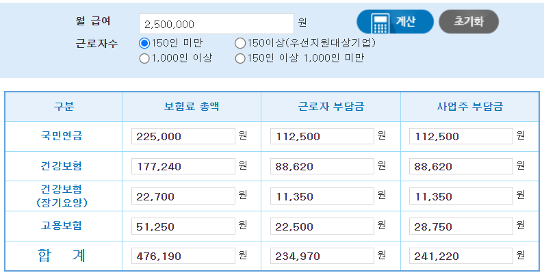 👉 예시로 250만 원을 입력하여 계산해보았습니다. 총 4대 보험 금액이 23만 원 정도 됩니다. 참고로 산재보험은 사업주가 100% 부담합니다.