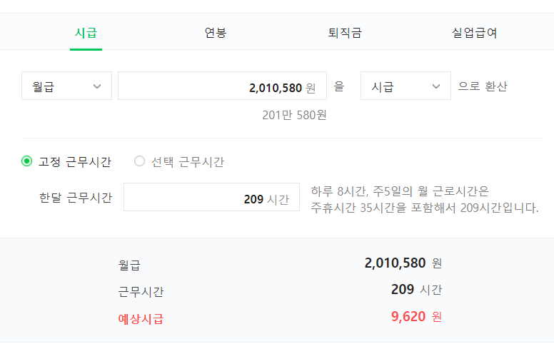 - 세전 2,010,580원이 최저시급으로 계산된 월급입니다.