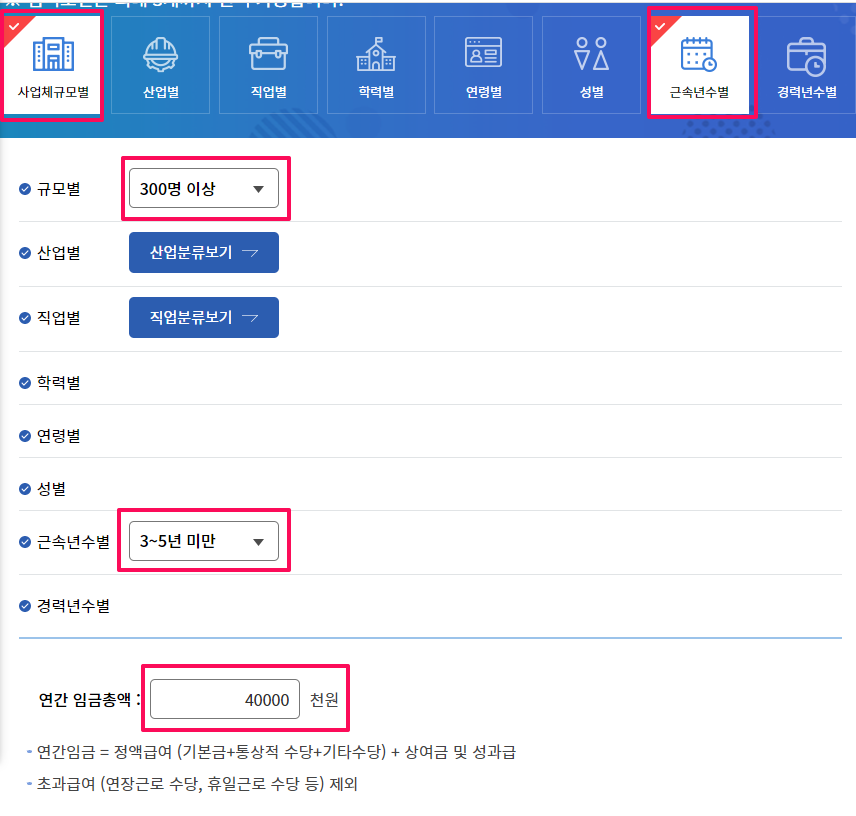 - 300명 이상 사업체에 근속년수 3~5년 사이라고 입력하고 연봉은 4천만 원으로 입력했습니다.