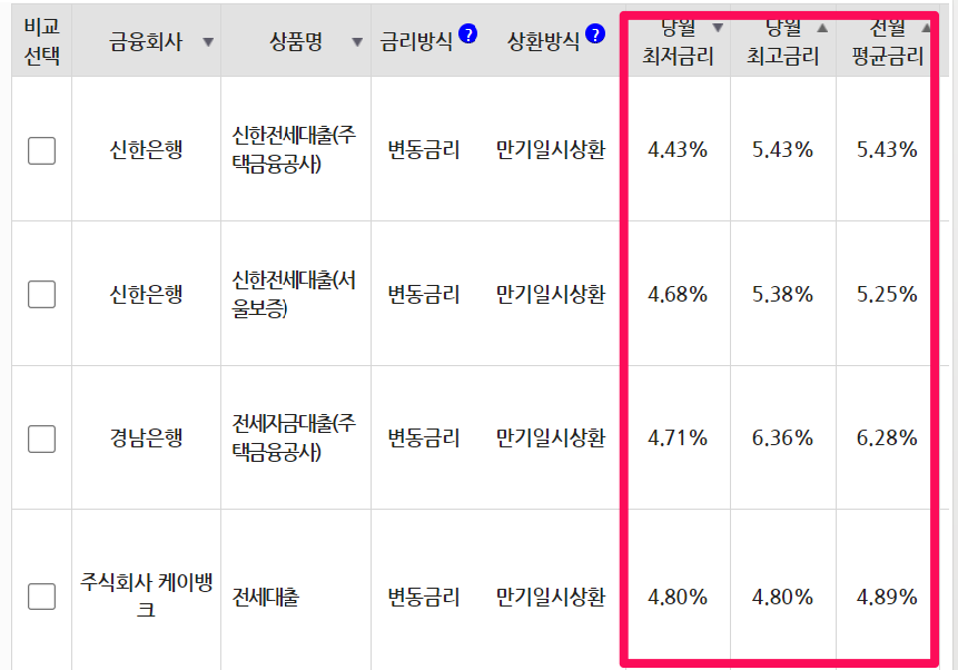 🔻 전세 대출 금리 비교 (금융감독원) 🔻