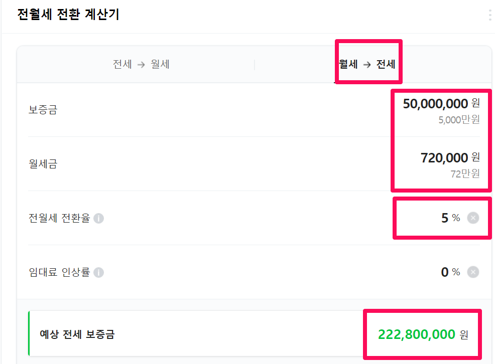 | (전세보증금 - 월세 보증금 5천만 원) × 0.05 (전환율 5%) ÷ 12 = 한달 월세 금액 72만 원 |