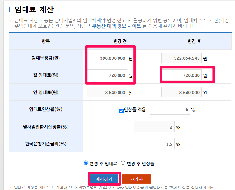 3) 인상률 5%, 월차임전환시산정률은 2%고 기준금리는 계산기 화면 하단에 있는 기준금리 3.5%를 적용합니다.