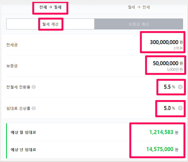 만약 현재 전세 보증금이 3억이고 향후 월 50만 원씩 월세를 내고 싶은 경우 보증금을 계산해보겠습니다.