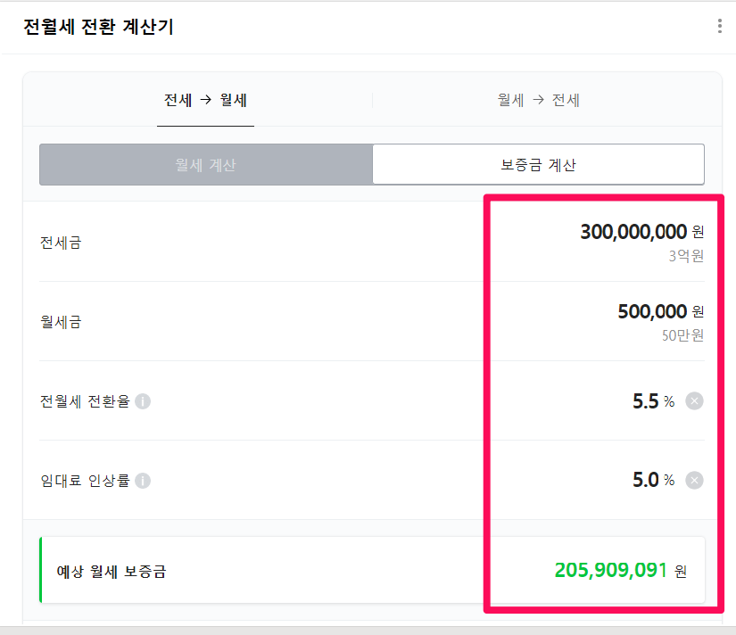 ▲ 전세 보증금과 월세 금액을 입력하고 협의된 전월세 전환율 5%를 입력합니다. 예상 전세 보증금을 확인합니다.