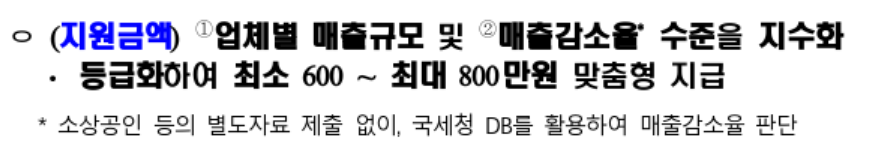 소상공인을 업종별로 분류하여 업종별로 매출 감소액을 산출하고 각 업종에서 매출 감소 구간을 나눠 지원금을 차등 지급하기로 하였습니다. 형평성을 고려한 조치라고 합니다. 코로나 2년 간 매출 감소를 고려한 지원금 지급 방식으로 피해가 많은 곳에 더 많은 지원금을 주는 것이 적절하다고 판단한 것입니다.