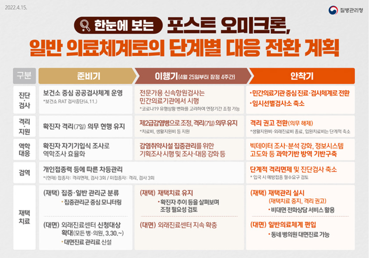 - 4월 25일부터 1급 감염병에서 격리 의무가 있는 2급 감염병으로 조정하며 4주 시행 후 6월 21일(예정)부터 확진자 격리 의무가 없어집니다.
