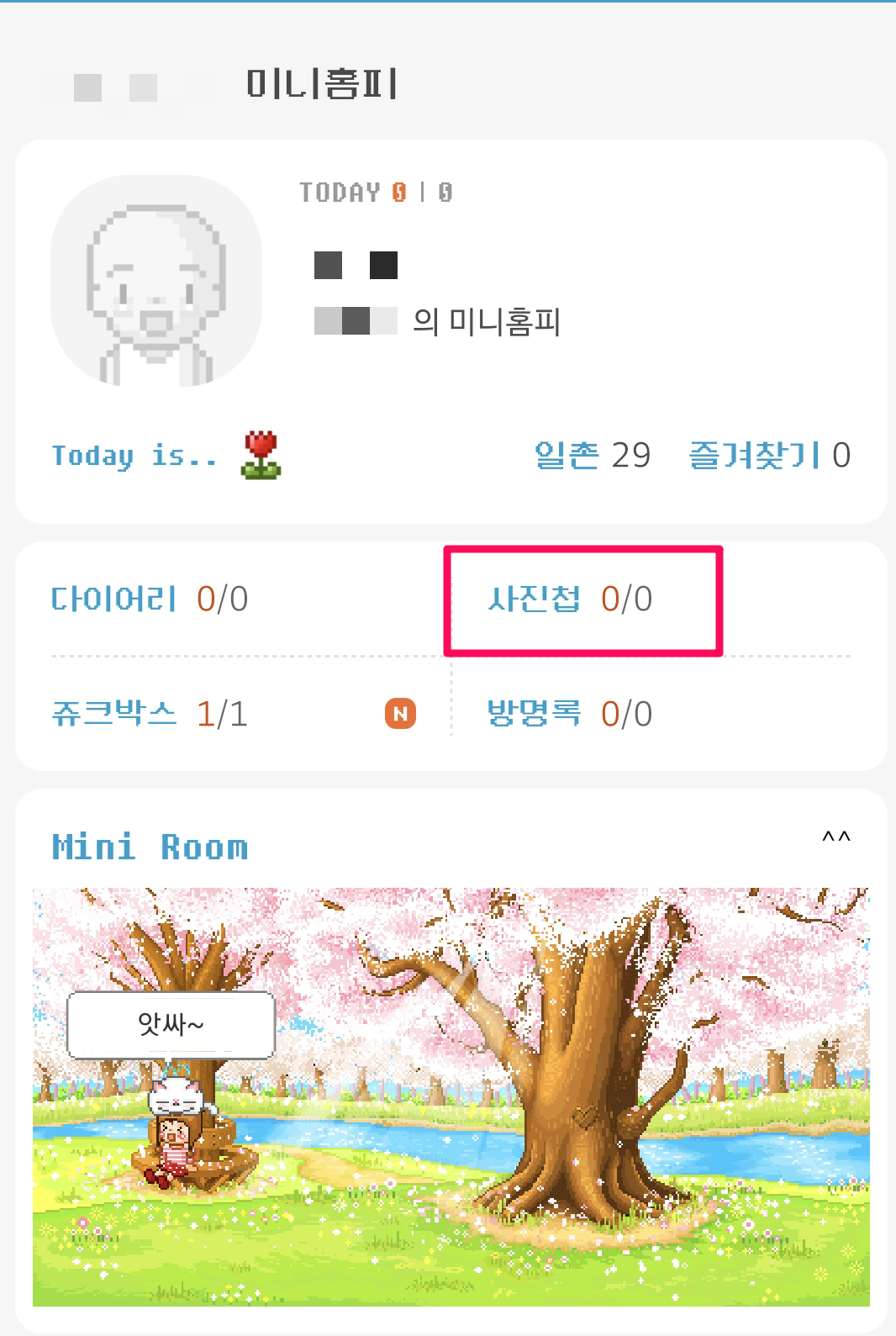 ▲ 보시면 사진첩은 복구되어 있지 않습니다. 눌러보면 복원 중이라는 팝업창이 뜹니다. 주크박스도 비어있고요. 미니룸만 예전에 설정한 그대로 되어 있습니다.