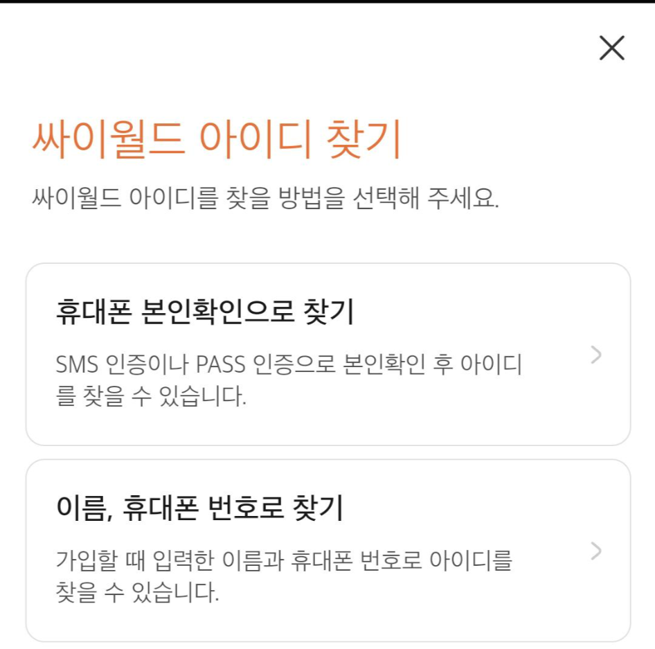 첫 화면으로 로그인 화면이 나오면 당황하지 마시고 하단에 있는 '아이디 찾기'를 선택합니다. 다음 화면 '싸이월드 아이디 찾기'에서 '휴대폰 본인 확인으로 찾기'를 선택한 후 본인 인증을 진행합니다. 휴대폰 인증하면 됩니다.