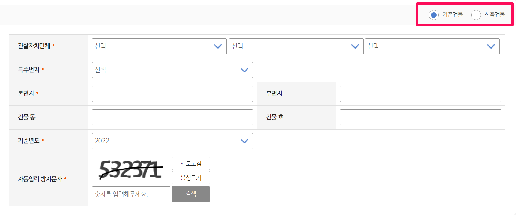 ▲ 기존건물과 신축건물로 나누어 조회할 수 있습니다. 지역과 번지, 기준연도를 입력하여 조회합니다.