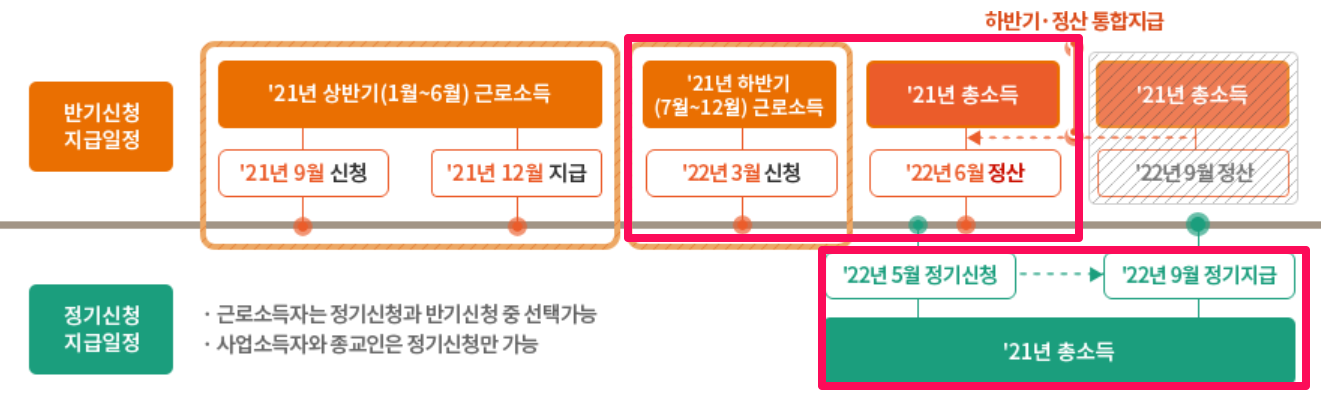 근로장려금 신청은 정기 신청과 반기 신청으로 나눌 수 있습니다. 정기 신청은 전년도 소득분에 대해 다음 해 5월에 신청하여 9월에 받기 때문에 반기 신청으로 미리미리 신청하여 받으면 좀 더 빨리 지급받을 수 있는데요. 신청시기와 지급시기가 서로 다릅니다.