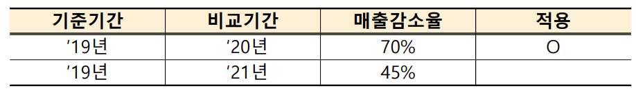 코로나 방역조치 기간 중 매출액이 감소한 사업체가 대상입니다. 19년, 20년, 21년 매출액을 비교하여 매출 감소율이 가장 높은 때를 기준으로 비교합니다.