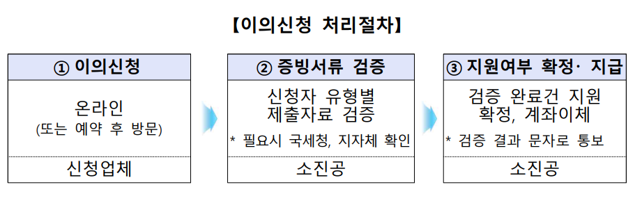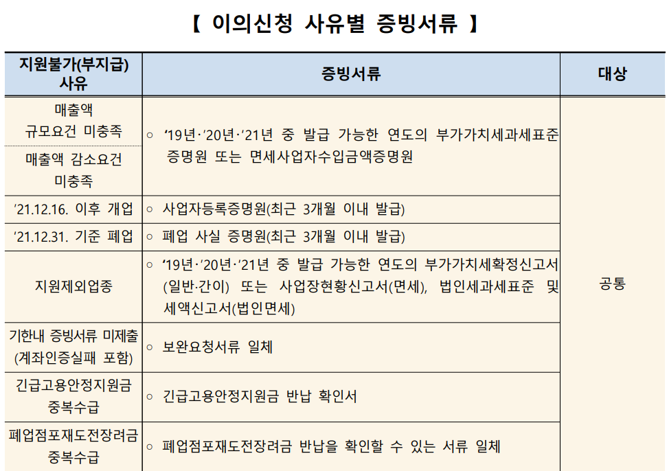 - 대상: 소상공인 손실보전금을 신청하였으나 지원불가 통보받은 소상공인이나 확인정보 확정금액에 미동의하여 지급받지 않은 사업체