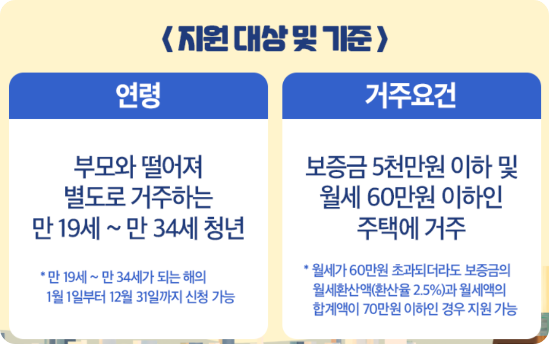 청년 지원 사업이므로 연령 제한이 있으며, 지원받을 주택의 보증금, 월세 조건을 1차적으로 충족해야 합니다.