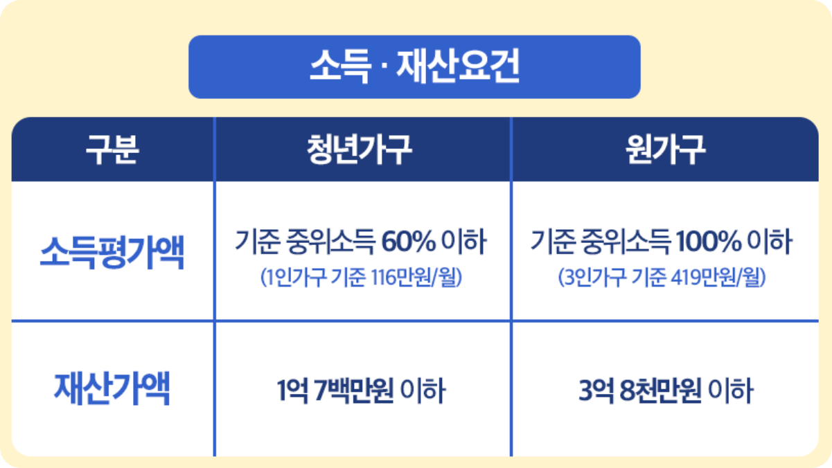- 청년가구: 중위소득 60% 이하 (1인 가구 기준 1,166,887원)