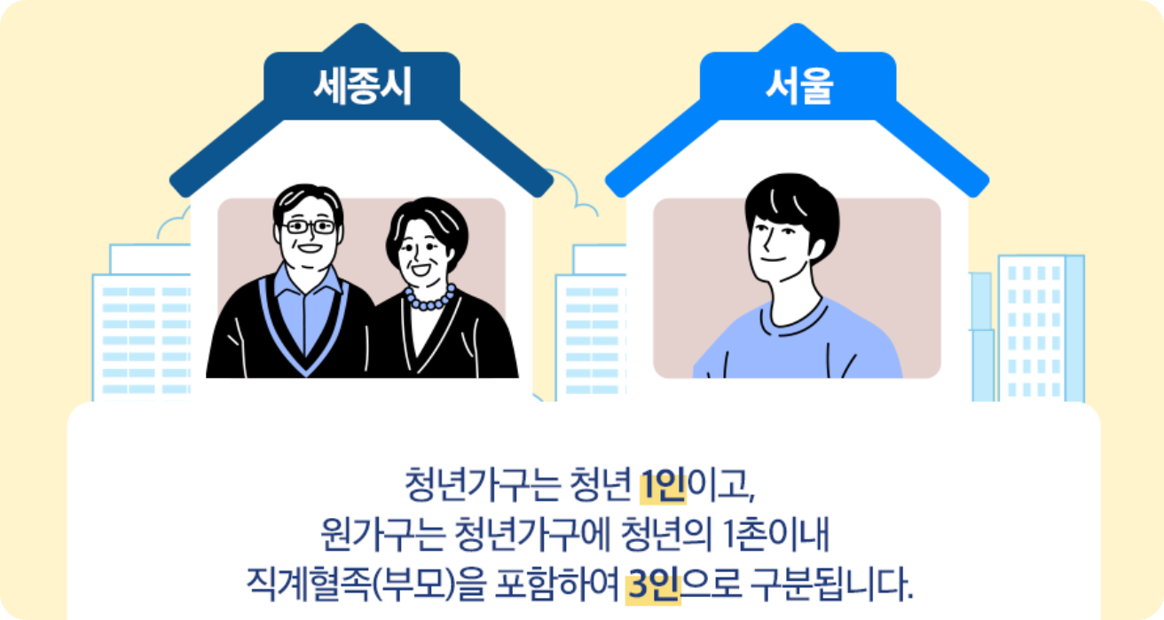 - 청년가구: 청년이 결혼한 경우 본인과 청년의 배우자, 직계비속, 동일 주소지에 거주 중인 가족