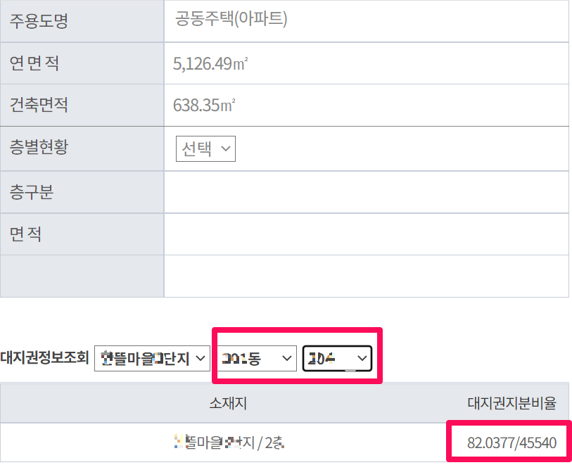 동호수를 선택하면 대지권지분비율을 확인할 수 있습니다.