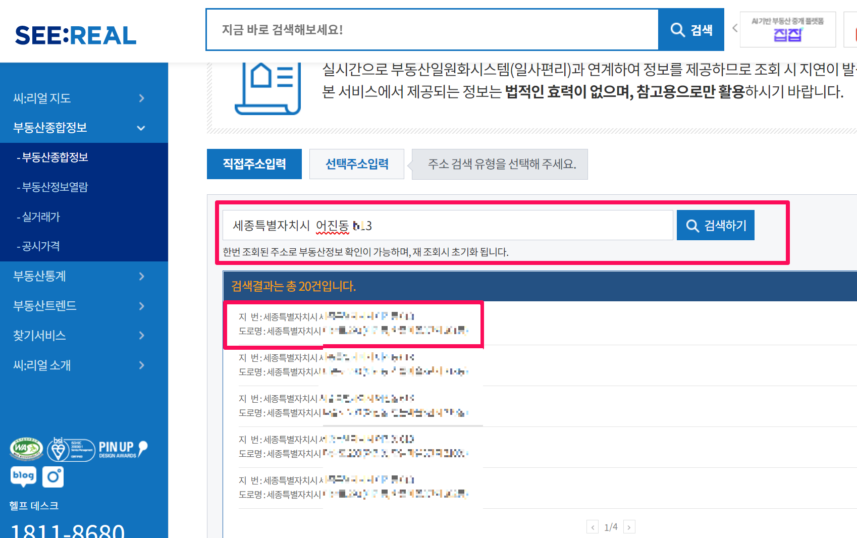 좌측에 부동산종합정보를 선택한 후 원하는 주소를 입력합니다. 저는 예시로 세종시에 있는 아파트를 입력했습니다.