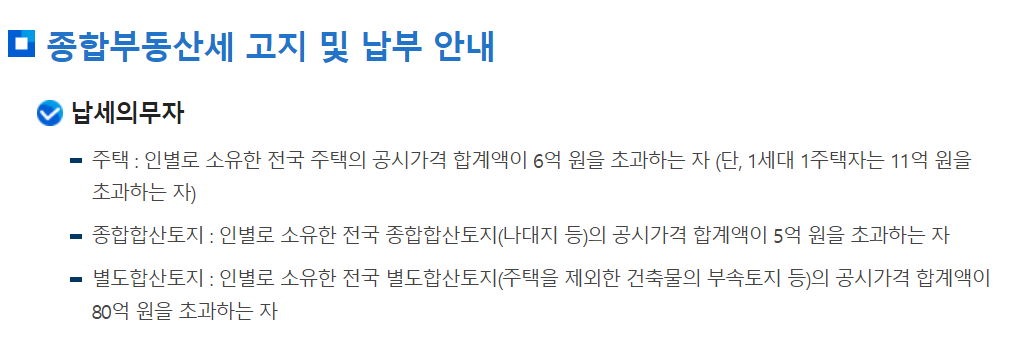 - 주택은 합계액이 6억 초과, 단 1 주택자는 11억 초과