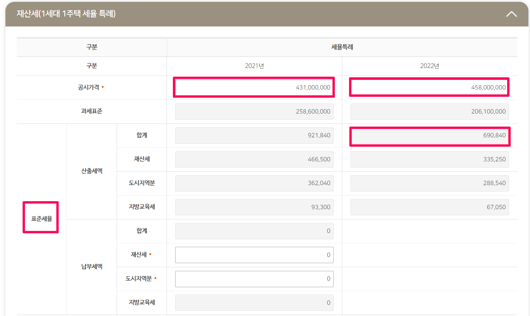 21년 공시가격과 22년 공시 가격을 입력합니다. 앞서 예시로 들었던 금액을 입력했습니다. 입력만 하면 결과가 자동으로 나옵니다. 표준세율과 특례세율이 모두 계산되며 본인이 해당되는 것을 확인하면 됩니다.