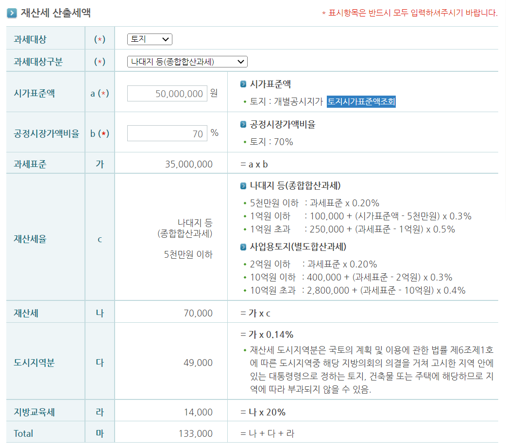 ③ 시가표준액(▼)에 토지 시가를 입력하면 재산세가 자동으로 계산됩니다.
