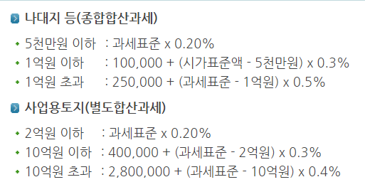 재산세 과세대상인 주택, 토지 등을 합산하여 아래와 같이 일정 금액을 초과하는 경우 부과되는 세금입니다.