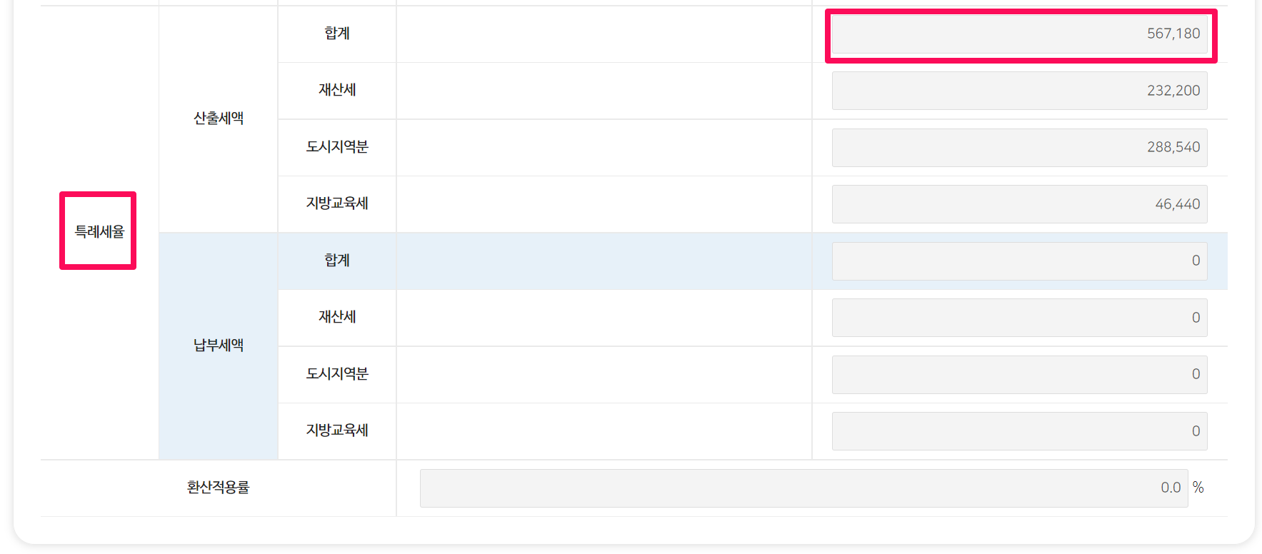 ▼ 예시는 특례세율 적용 대상자이므로 아래로 내려가 특례세율 금액을 확인합니다. 56만원 정도로 위에서 계산한 것과 동일한 금액이 계산됩니다. 표준세율보다 13만원 정도 저렴합니다.