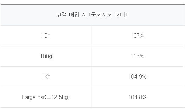 하나은행을 예로 들면 국제시세 대비 아래 %로 구매가 가능합니다. LS골드바만 취급하고 있으며 하나은행 전 영업점에서 구매가 가능하다고 합니다.
