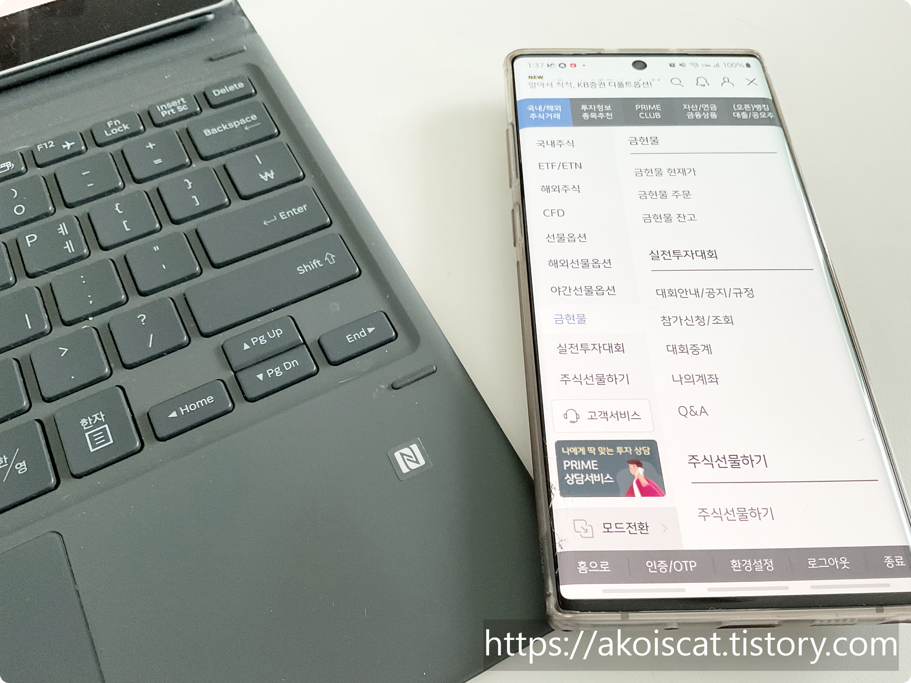 ▼ 예시로 KB 증권에 들어가 보면 좌측 탭에 '금 현물'이라고 보입니다. 거래하려고 하면 금 현물 계좌를 개설해달라고 합니다.