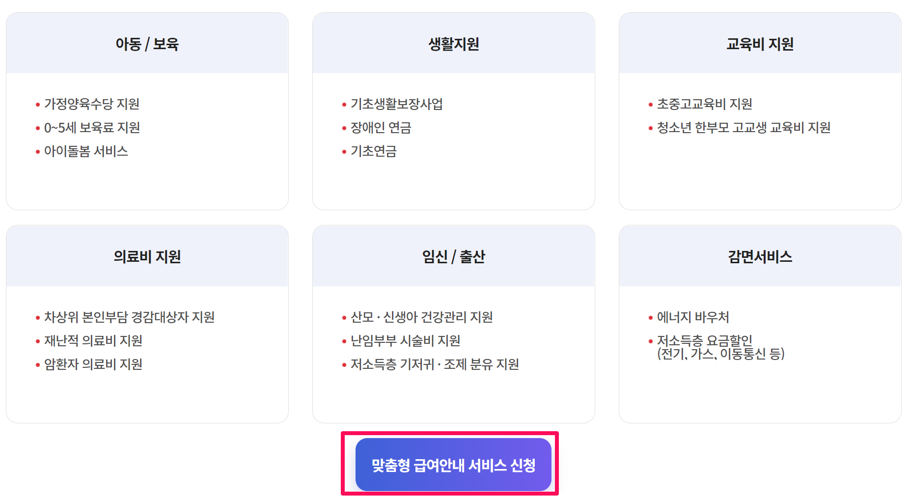 ▲ 안내 페이지에서 하단으로 쭉 내려간 뒤 '맞춤형 급여안내 서비스 신청'을 선택합니다.