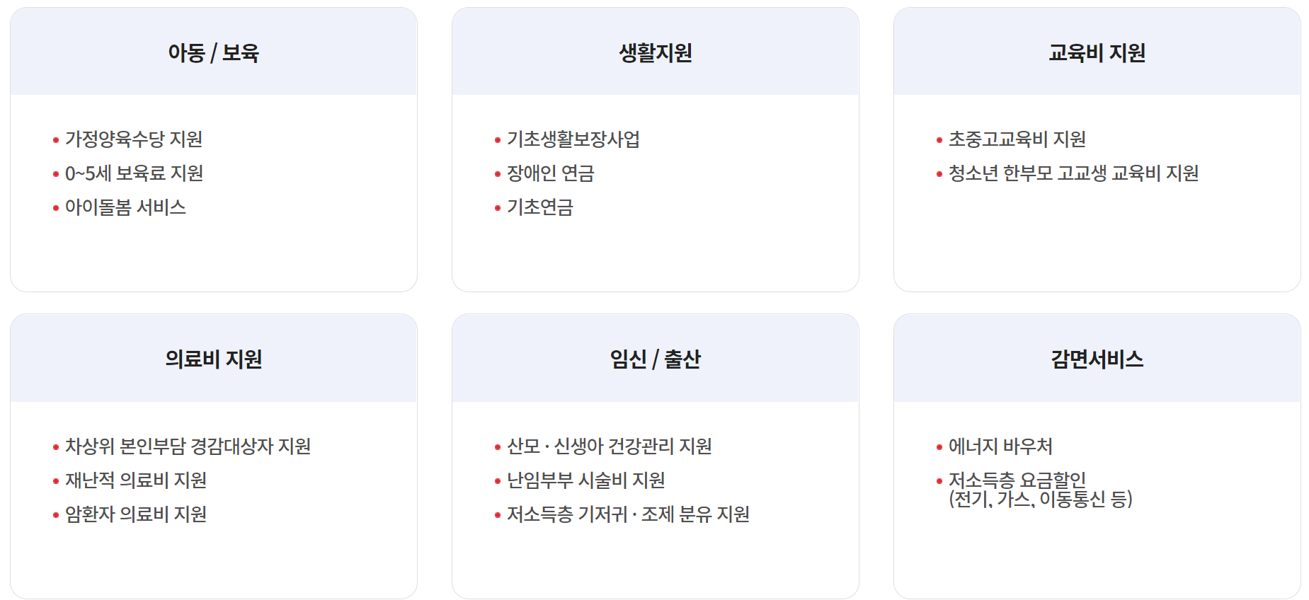 가정 양육수당, 기초연금, 기초생활보장, 교육비 지원, 재난적 의료비 지원, 임신/출산 지원, 에너지 바우처 등 다양한 복지 서비스가 안내되는데요.