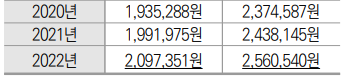 - 22년: 단독 가구 180만원, 부부가구 288만 원이며 지급액은 30만 7500원입니다.