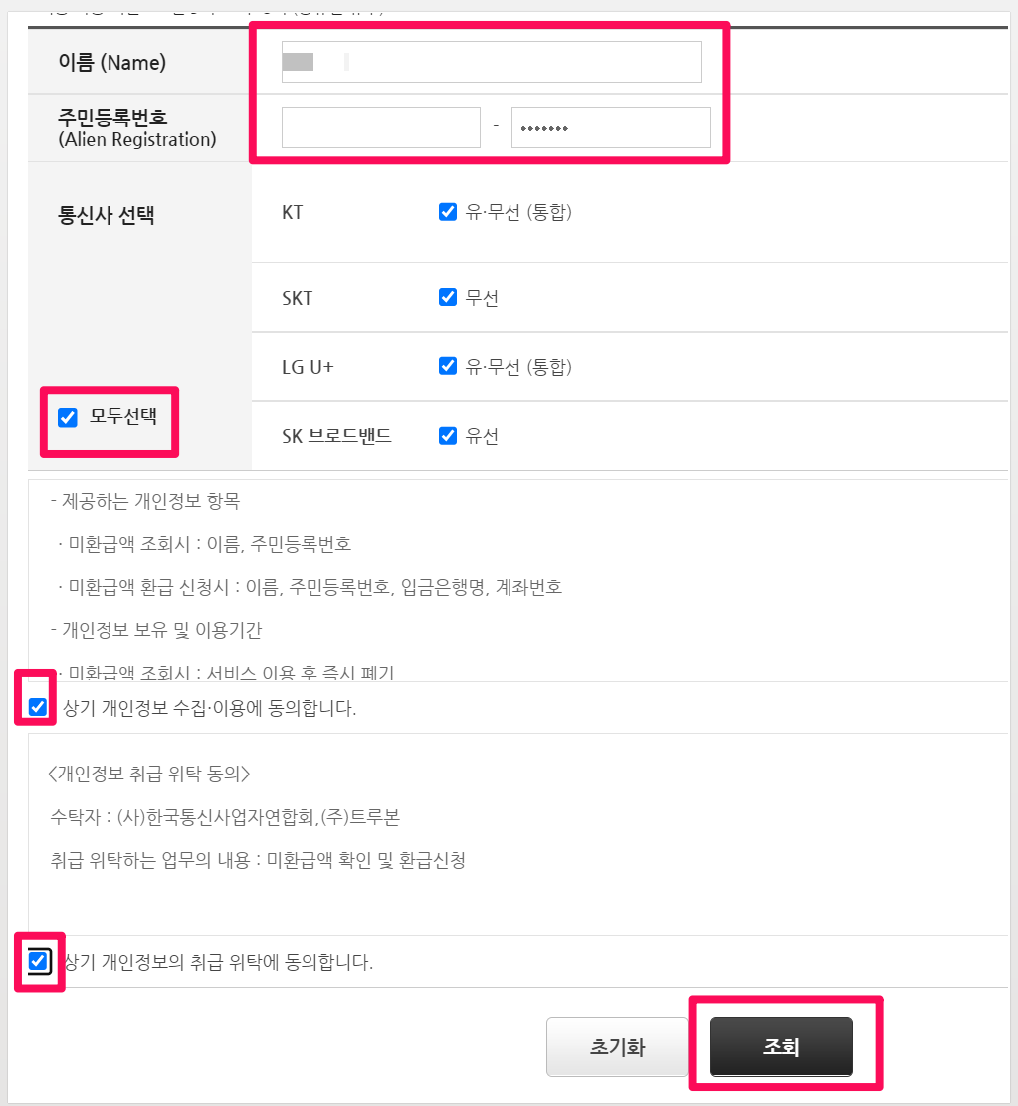 와이즈유저 사이트에서 유료방송 미환급액 혹은 통신사 미환급액을 선택한 후 정보를 입력하여 조회하면 됩니다.
