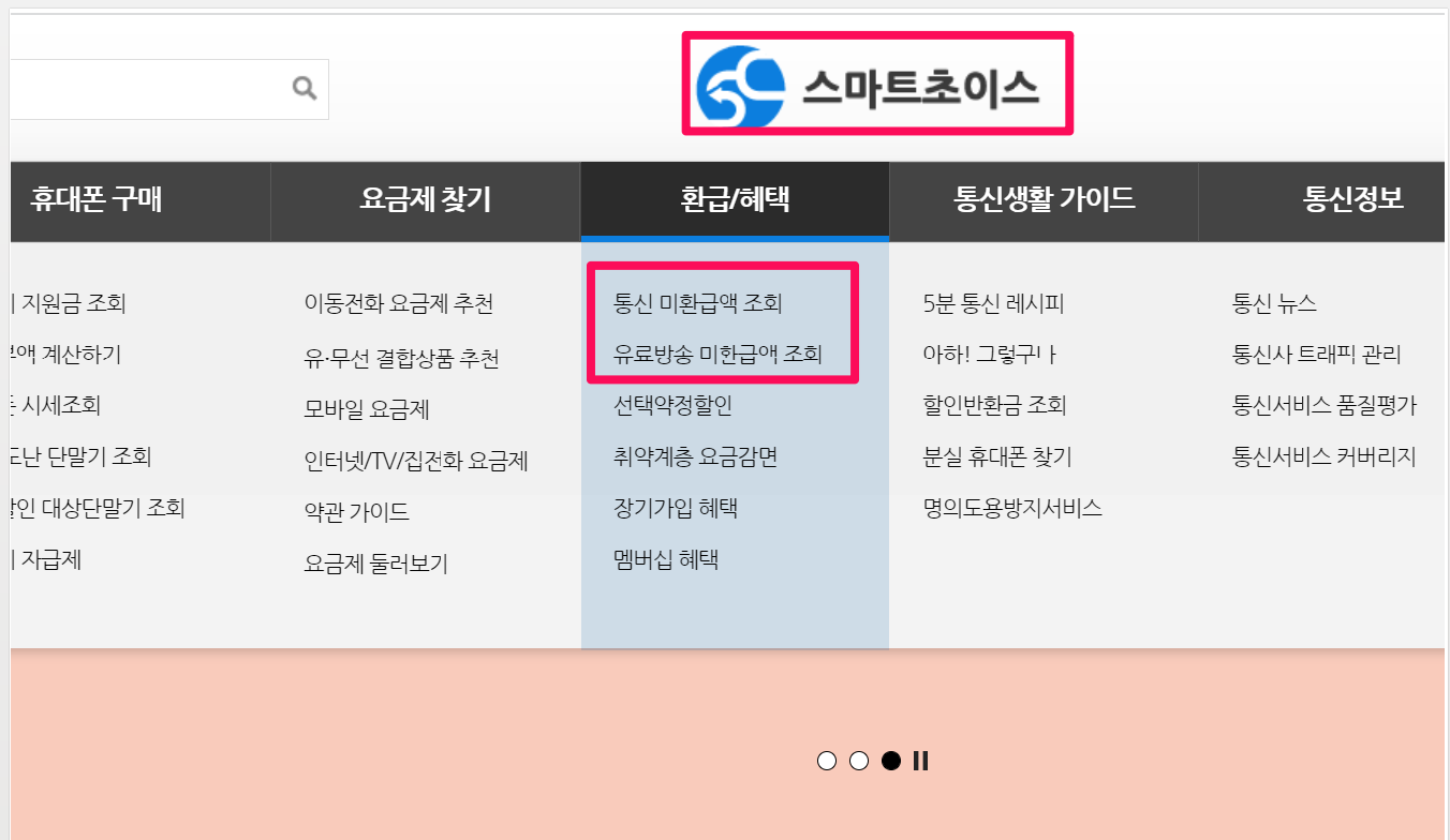 ① 스마트초이스 홈페이지> 환급/혜택> 통신 미환급액 조회