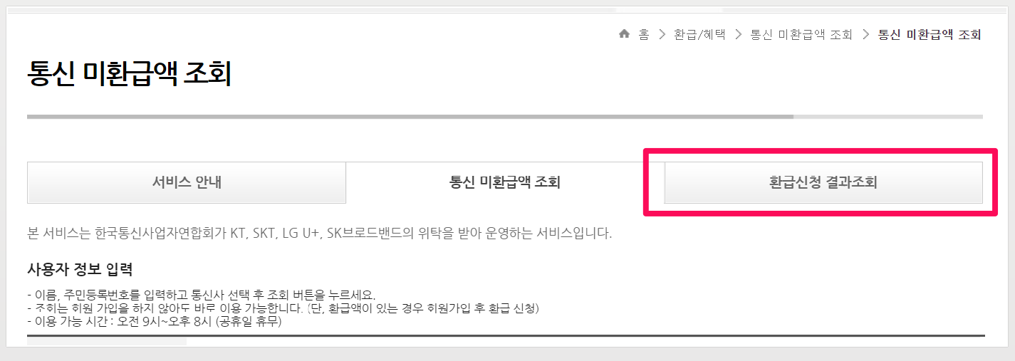 미환급금이 있어서 신청했다면 통신 미환급액 조회> 환급신청 결과조회에서 확인할 수 있습니다.