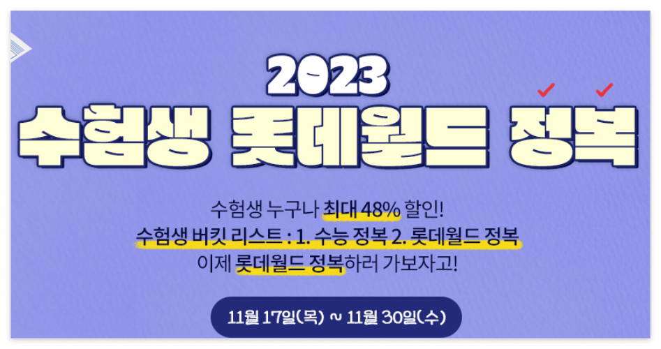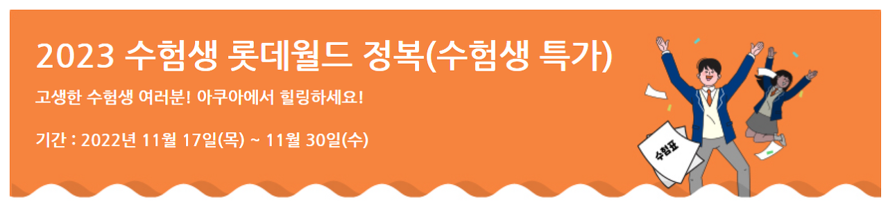 - 할인방법: 매표소에서 2023 수능 수험표 or 접수증 or 수시합격증 원본과 사진이 부착된 신분증을 제시해야 합니다.