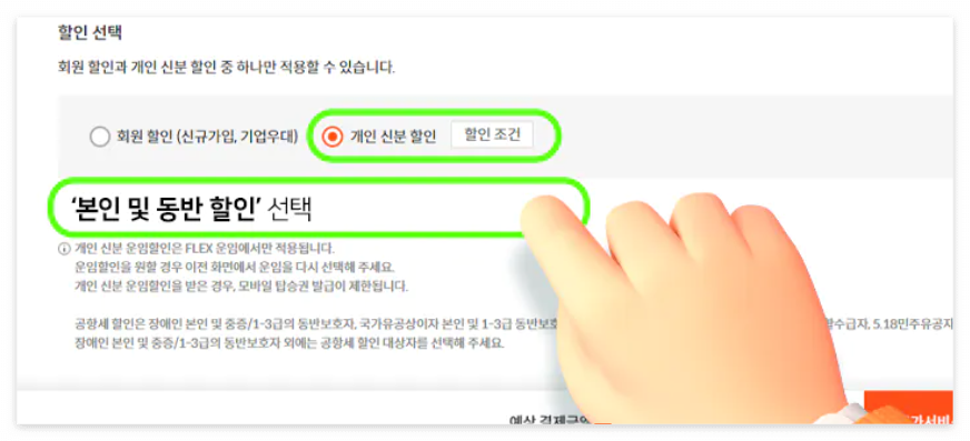 ② 탑승객 정보 입력 시 개인 신분 할인 > 본인 및 동반할인 선택합니다. 플렉스 운임 기준 20%를 할인해줍니다.
